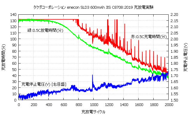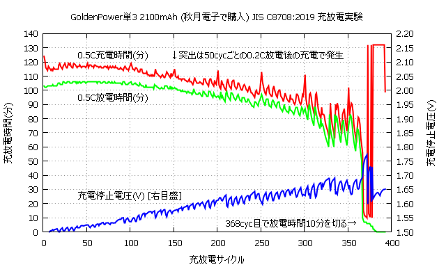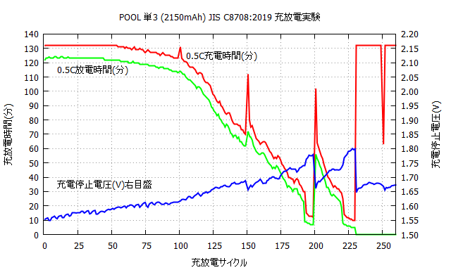| ●新しいJIS C8708:2019によるニッケル水素電池の寿命計測 ※0.5C充放電でのデータをピックアップ。 50サイクルごとの0.1C充電、0.2C放電の データは除外してグラフに。 赤 : 充電時間 0.5Cで充電。 -ΔV検出で停止。 検出失敗時は132分で制限。 緑 : 放電時間 0.5Cで1.0Vまで放電。 2時間(120分)が定格。 サイクルが進むと容量減少により時間が短くなる。 青 : 充電停止電圧 -ΔVを検出した電圧。 寿命末期になると内部抵抗増大の影響で 電圧が上昇。 |